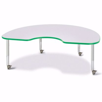 Educators can easily interact with individual children without disturbing others with Kidney Table. Accommodates up to 9 chairs. The legs adjust from 20” to 31” high, are 2” thick, and feature heavy-duty casters. Freckled gray tabletop with green TRUEdge,