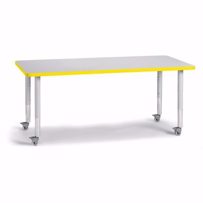 The perfect table for any occasion. Accommodates up to 8 chairs. The legs adjust from 20” to 31” high, are 2” thick, and feature heavy-duty casters. Freckled gray tabletop with yellow TRUEdge, gray legs, and gray casters.