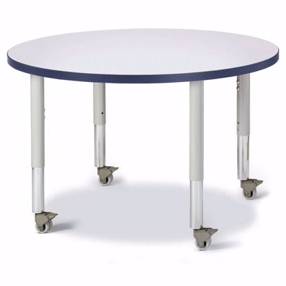 These round tables are excellent for allowing children to interact with each other during projects. Accommodates up to 4 chairs. The legs adjust from 20” to 31” high, are 2” thick, and feature heavy-duty casters. Freckled gray tabletop with navy TRUEdge,