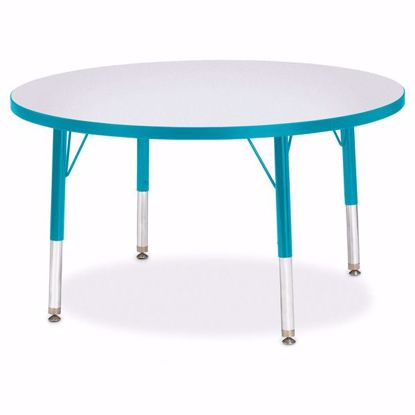 These round tables are excellent for allowing children to interact with each other during projects. Accommodates up to 4 chairs. The legs feature glides that reduce noise, prevent snags, and don’t rust. Freckled gray tabletop with teal TRUEdge and teal le