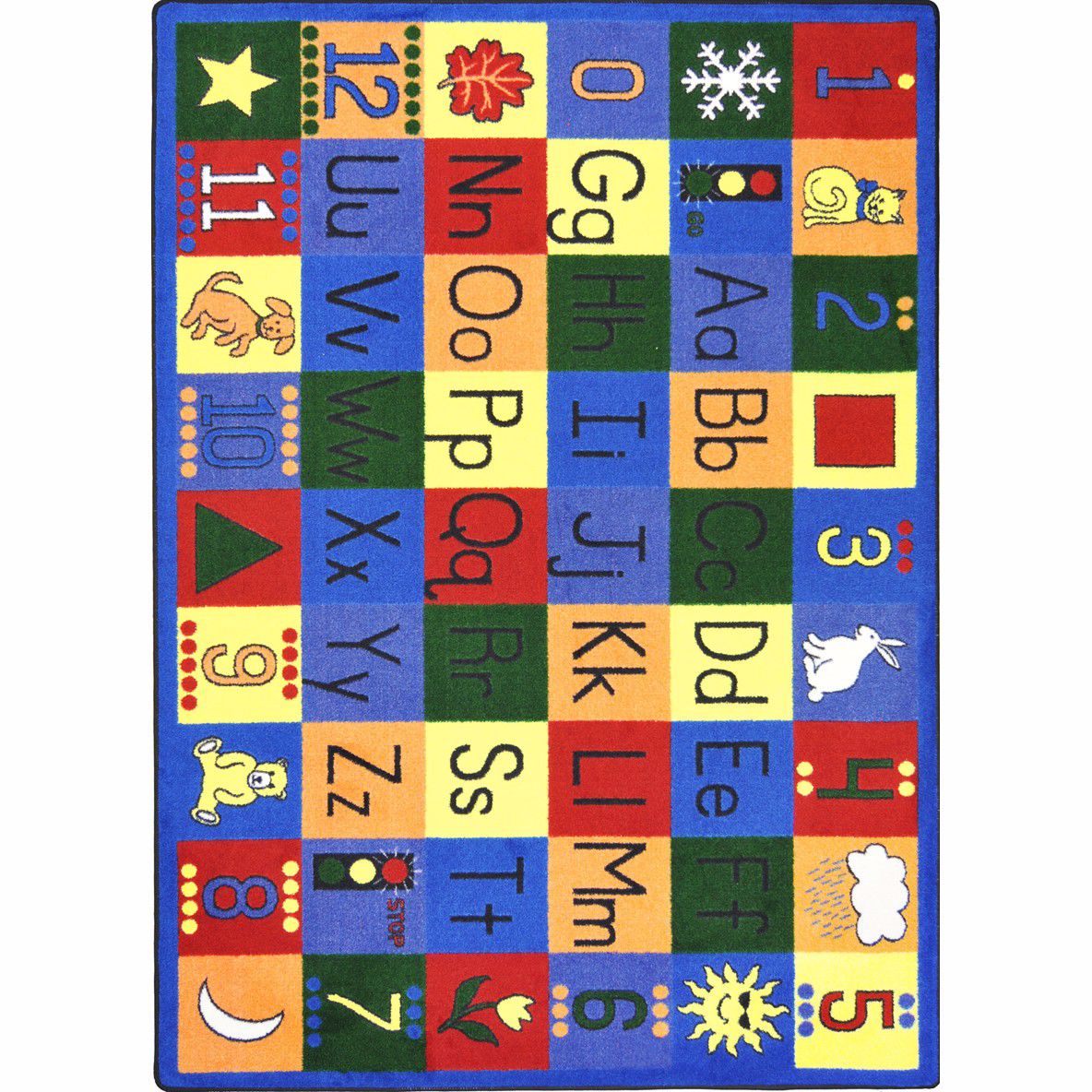 Children will find numbers, upper case and lower case alphabet, seasons, shapes, animals, and fun on this appealing classroom rug.