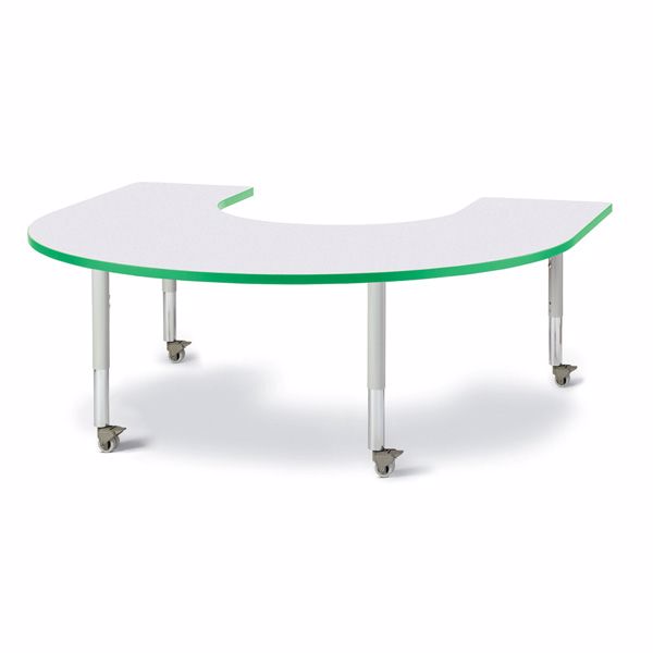 Children can center around an educator easily with horseshoe tables. Accommodates up to 9 chairs. The legs adjust from 20” to 31” high, are 2” thick, and feature heavy-duty casters. Freckled gray tabletop with green TRUEdge, gray legs, and gray casters.