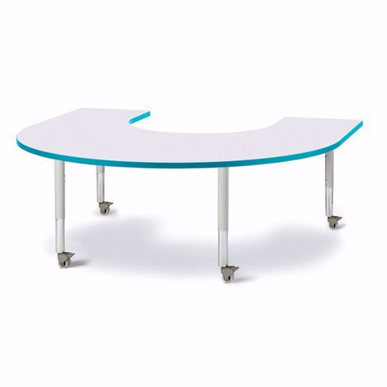 Children can center around an educator easily with horseshoe tables. Accommodates up to 9 chairs. The legs adjust from 20” to 31” high, are 2” thick, and feature heavy-duty casters. Freckled gray tabletop with teal TRUEdge, gray legs, and gray casters.