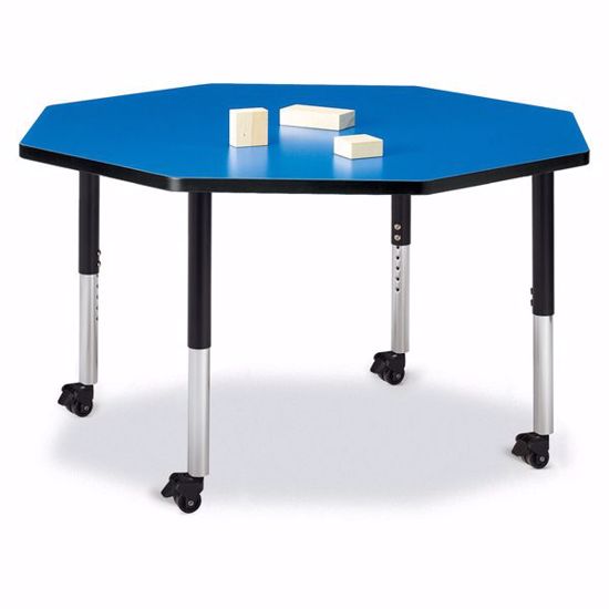 Kids will enjoy learning together while having their own space with the Octagon Table. Accommodates up to 8 chairs. The legs adjust from 20” to 31” high, are 2” thick, and feature heavy-duty casters. Blue tabletop with black TRUEdge, black legs, and black