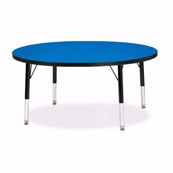 These round tables are excellent for allowing children to interact with each other during projects. Accommodates up to 6 chairs. The legs feature glides that reduce noise, prevent snags, and don’t rust. Blue tabletop with black TRUEdge and black legs.