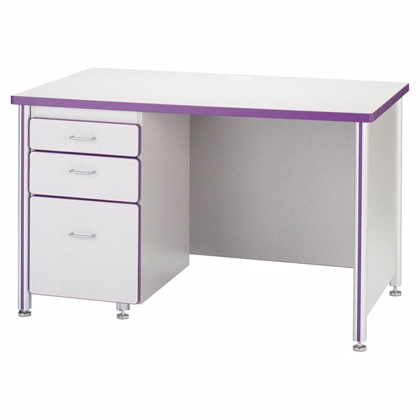 The perfect teacher's desk for any classroom! The single pedestal has two smaller drawers for smaller items and one high-sided bottom drawer for hanging files. Features a freckled gray laminate top with red TRUEdge®.