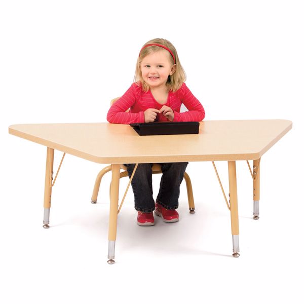 Great for students of any age, multiple trapezoid tables can be arranged in many configurations to accommodate any space. Accommodates up to 5 chairs. The legs feature glides that reduce noise, prevent snags, and don’t rust. Maple tabletop with maple TRUE