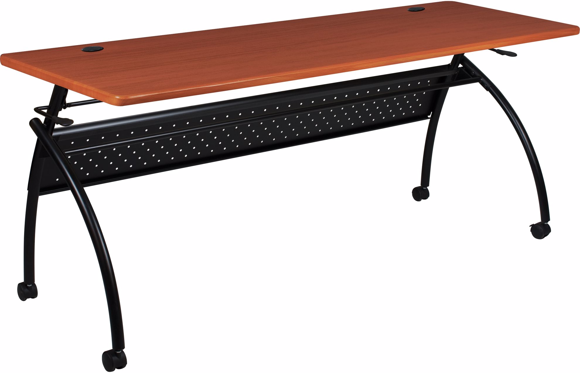 Elegant Chi Flipper Tables are the ideal table for virtually any training or conference room setting. Versatile and mobile tables are stylish and functional. Tops are vacuum-formed PVC with either a cherry woodgrain or gray nebula finish, and flip back with a simple lever mechanism for easy transport, set up, and break down, and nest for compact storage. Frame is black powder-coated steel with a full length stretcher bar and a privacy panel. Roll easily into place on 2" casters (two locking). Has achieved GREENGUARD GOLD Certification. Tested to support up to 300 lbs. TAA compliant.