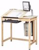 The drawing table system lets you choose from 11 table options. Besides the plain model the options include: six drawers, board storage for six, and combination six drawer with board storage. The deluxe model also includes a CPU holder, a monitor arm, keyboard tray, and mouse tray. All units are constructed of solid maple framing and reinforced with 13-gauge steel corner braces. Your choice of a one- or two-piece top made of 3/4" almond colored plastic laminate and equipped with a soft-close feature and a pencil stop. The top adjusts from 0 to 30 degrees. On the one-piece top models, the fully adjustable top measures 42"W x 30." On the two-piece top, the 30" x 30" left side of the top can be fully adjusted and is equipped with a soft-close feature and a pencil stop with a 12"W x 30"D flat top on the right side of the unit. CPU holder dimensions are 23"H x 11" W x 29"D (all adjustable). All the doors and drawers lock, and the drawers are completely finished and dovetailed on all four sides. The board storage models has six (25-1/4"H x 24-3/8"D x 1-1/4"W) spaces for drawing boards. Overall size:42"W x 30"D x 39-3/4"H.