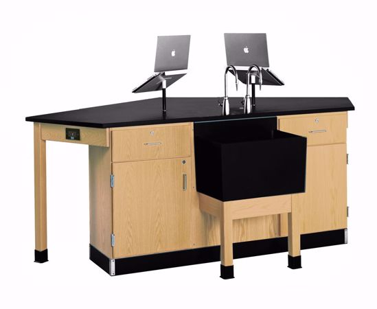 This popular workstation meets the needs of students and teachers today. The ForwardVision™ 4-Student Workstation allows four students to work at a single station while all are facing the teacher. The unique design leaves enough room to store four stools (not included) under the workstation. Sink units come with two combination cold water/gas fixtures. The 2916KLH and 2936KLH include two rod sockets and LabHands for holding laptop computers and books. All the units come with two GFI electrical outlets, and ample storage. Choose from two models of cabinets: Door cabinet with two adjustable shelves or the door/drawer cabinet with one adjustable shelf and a drawer. The stations are finished with a chemical resistant, earth-friendly UV finish. All doors and drawers lock. Dimensions: 96"W x 50"D x 36"H.