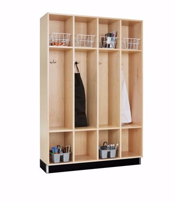 Store backpacks, coats and totes in these sturdy wood lockers. The backpack units are available in oak or maple veneer and contains one section. Each section contains two smaller cubbies and a larger backpack cubby. The locker section has a double hook mounted for hanging jackets and backpacks. The sections are divided with 3/4" veneered plywood and finished with a hard, UV finish. The back is designed to be anchored to a wall for stability. Black rubber base molding gives the locker unit a finished look.