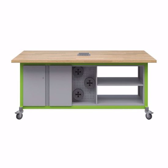 Maker table, 42d x 84w, butcher block top 1 double storage module with doors, 1 peg board storage module, 1 double storage module without doors and locking casters.