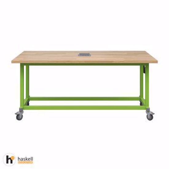 Maker table, 42d x 84w, butcher block top, power unit with 8ft extension cord and locking casters. Add up to 5 storage modules, sold separately.