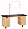 Perfect for the physically impaired or for classroom demos. Constructed of solid oak, hardwood and oak veneers with a chemical resistant, earth-friendly UV finish. The 1-1/4" ChemGuard top is supplied with or without a stainless steel look sink, toggle switch water pump, two 2-1/2 gallon supply and waste containers, GFI AC duplex receptacle with inlet socket, 25' extension cord, and two rod sockets installed in the table top. Mobile capacity of 500 lbs. it rolls easily on 4" ball-bearing swivel casters with brakes. Dovetailed drawers are constructed of plywood and ride on epoxy coated glides. Cupboard door and drawers have locks. Wheelchair accessible from two sides, measures 32"W x 29"H. Inside drawers measure: 14.5"W x 19"D x 6"H. Dimensions: 72"L x 24"D x 33"H. Weight: 240 lbs.