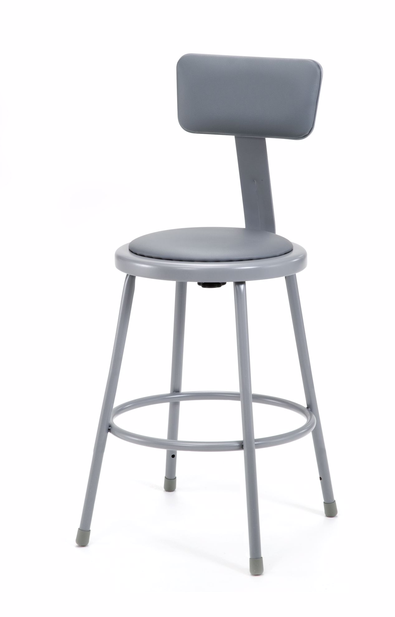 The fortified construction and soft comfort of the 6400 Series heavy-duty padded stools with backrests are ideal for hands-on educational settings like art rooms, science labs, home economics or shop classrooms. This reliable stool features a sturdy frame of 18-gauge steel tubing securely welded to a 14" diameter seat pan. Riveted through the steel pan are 1/2"-thick gray vinyl cushioning that will provide years of dependable use. Footrest ring is securely bonded to each leg with four spotwell contact points. The padded adjustable backrests can be moved two inches up/down and forward/back.