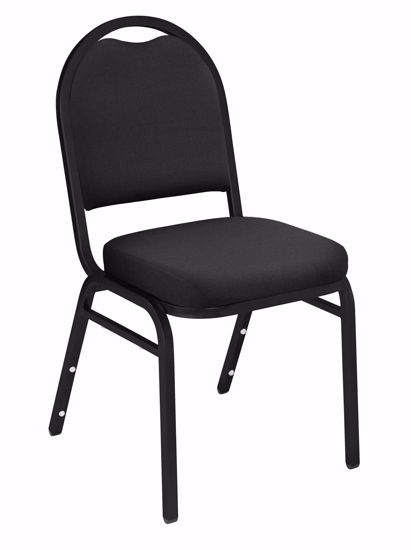 The 9200 Dome-Back stack chair is durable and classy enough to use in your busiest social setting, be it a dining room or corporate banquet hall. It features a strong square 18-gauge steel frame plus an under-seat H-shaped brace for extra support. The seat features supremely comfortable and spacious 2"-thick high-density foam padding with easy-to-clean vinyl upholstery or institutional grade fabric, and a waterfall-style edge. MDF core within both the seat and rounded backrest which has a built-in handle for easy moving and stacking. Fortifying stacking bars and twelve plastic bumpers protect the powder-coated paint finish from scratches when the chair is stacked (up to ten units high).