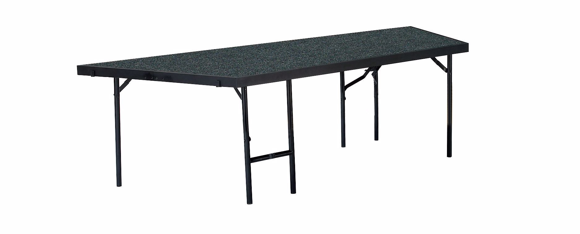 The NPS Portable Carpeted Stage Pie is used to create customized bow, oval or ring-shaped configurations. It's the reliable and affordable choice for your school performances and assemblies. Users are supported by a heavy-duty, 16-gauge steel, black powder-coated frame. The premium 3/4" thick plywood deck is durable and features a firmly-affixed carpeted surface. Legs are constructed with 14-gauge steel tubing and feature simple and safe spring-loaded locking mechanisms allowing for quick set-up assembly and folds up easily for manageable portable storage. The stage offers a secure weight capacity of over 200 lbs. per square foot. High-impact plastic glides will ensure floors are protected from damage. Firmly welded ganging devices let users combine equal-height stages to create a large single stage platform or assemble different sizes to create choral or band riser configurations. Ships fully assembled.