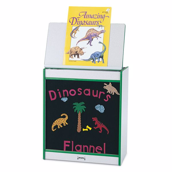 A Big Book language enrichment station on wheels! Easel folds down over storage space when not in use. Flannel front for adding to your story. Vertical big book partitions in back for storing a multitude of books. Overall approximately 43" high.