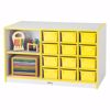 Just the right height for work and easy access from both sides. One side features three roomy shelves. The other side features two shelves and twelve cubbie-tray openings. Cubbie-Trays not included.