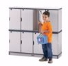 This Double stack of lockers provides space for eight kids. Different locks and keys for secured lockers. Individual lockers are 10.5" wide x 12.5" deep x 20" high. Stacked lockers must be fastened to a wall. Note: The unit has four small holes and threaded inserts through the top for stacking units.