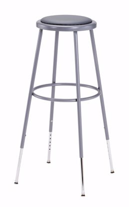 The fortified construction and soft comfort of the 6400 Series heavy-duty padded stools are ideal for hands-on educational settings like art rooms, science labs, home economics or shop classrooms. Height-adjustable legs extend from 32" to 39" in 1-inch increments. This reliable stool features a sturdy frame of 18-gauge steel tubing securely welded to a 14" diameter seat pan. Riveted through the steel pan are 1/2"-thick gray vinyl cushioning that will provide years of dependable use. Footrest ring is securely bonded to each leg with four spotwell contact points.