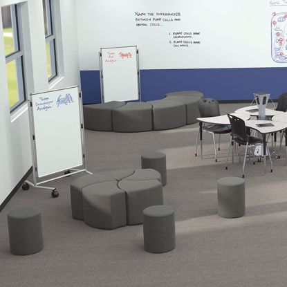 The compact form factor of the smaller stool saves floor space while also making it perfect for classroom configurations. Upholstered in a durable neutral gray fabric. Frame constructed utilizing construction grade plywood and hardwood for durability and flexibility.
