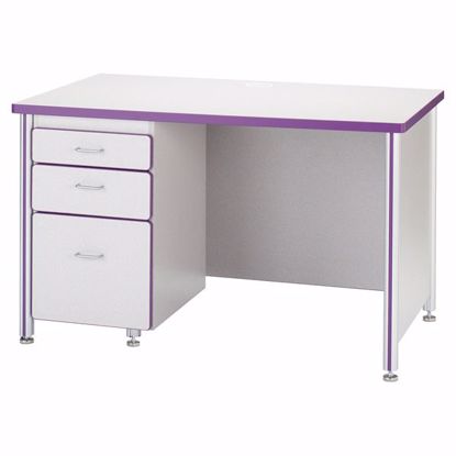 The perfect teacher's desk for any classroom! The single pedestal has two smaller drawers for smaller items and one high-sided bottom drawer for hanging files. Features a freckled gray laminate top with purple TRUEdge®.