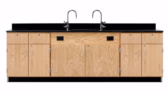 Need all your services in one place or looking to add a wall of cabinets that include services? The Wall Service Bench offers storage and services all in one unit. Constructed of solid hardwood and oak veneer plywood. The Wall Service Bench features your choice of a 1" solid epoxy resin or phenolic resin top with a 18"W x 15"D x 11"H epoxy resin sink and two combination cold water/gas fixtures. The sink area allows access to the plumbing and provides a large storage space with two GFI protected AC duplex electrical outlets. There is enough room in the sink area to allow two 24"D tables to be butted against the unit for use as a peninsula work area. The outer ends of the unit offer four storage solutions: Doors with Adjustable Shelves, Doors/Drawer Combination w/1 Adjustable Shelf, 4 Drawers/doors w/1 Adjustable Shelf and 4 Drawers. All drawers and doors have locks and ADA compliant pulls. The unit is finished with a chemical resistant, earth-friendly UV finish and includes rubber base molding. Dimensions: 108"L x 24"D x 36"H.
